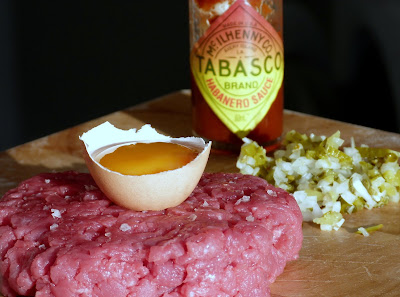 For me there an be few better seduction meals than steak tartare. Although the idea of raw beef and egg yolk might not seem like the classical choice for a romantic evening à deux, I find it rather can be rather alluring. Maybe it harks back to our hunter gatherer days, red in tooth and claw, or maybe it's just because it tastes bloody good. Whatever the reason a mound of hand-chopped steak with the appropriate accompaniments (and perhaps a little glass of vino tinto) is a simple and satisfying supper to make for a loved one. And if it's just you, or your date's not into uncooked cow/a vegetarian, then all the better - plenty of second helpings!